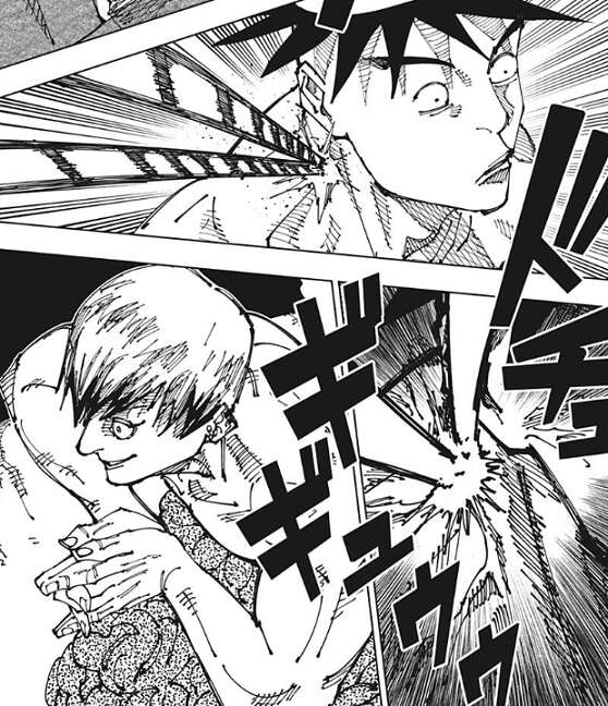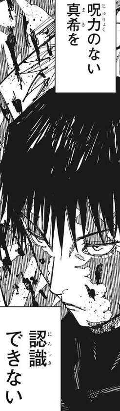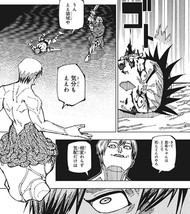 三代は倒れてしまい、大道も身動きが出来なくなってしまいます。直哉は2人が血まみれになっている様子を見て、うん ええ領域やわ、気分ええわ、とつぶやき、真希の気配を探ります。しかし、真希の気配を感じることが出来ません。直哉は、いくら甚爾と同じように呪力が無くなったからといって、自分の領域展開の中で居場所が分からない事があるのか?と、疑問に思います。その時、大道が刀を強引に振ろうとしますが、領域の効果で腕まで吹っ飛んでしまい刀が直哉の方に飛んでいきます。