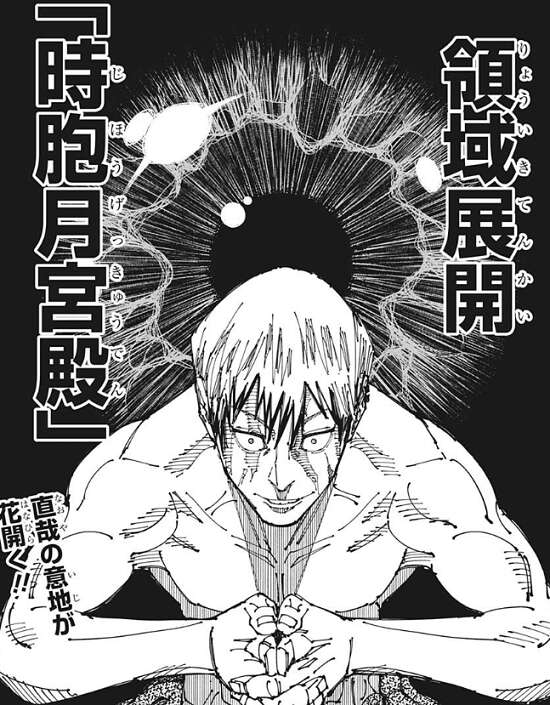 直哉は領域展開「寺胞月宮殿(じほうげっきゅうでん)」を使用します。大道と三代は領域の中にいて、直哉からの攻撃をくらいます。
