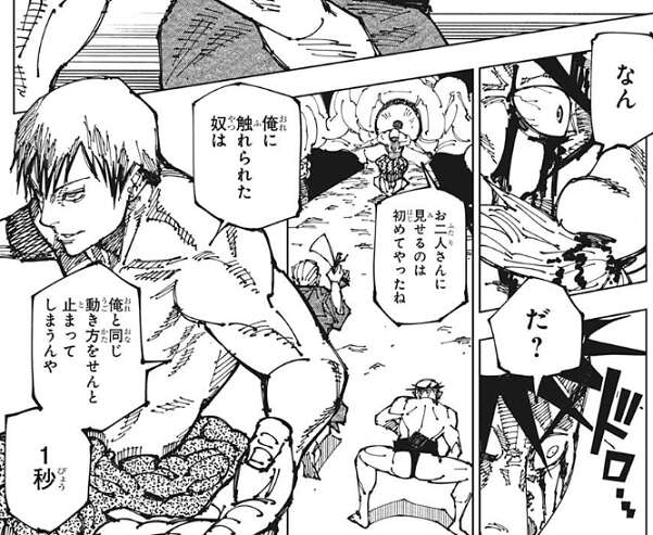 すると、大道と三代は動いた途端に、全身から大量出血し始めます。直哉は大道と三代に、俺に触れられた奴は、俺と同じ動きをせんと止まってしまうんや 1秒、と術式・投射呪法の説明をします。この領域展開の中でも、投射呪法と同じ効果があるようです。