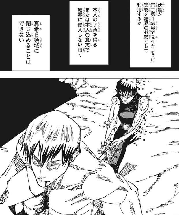 すると、真希がいつの間にか直哉に背後にいて、飛んできた刀を受け取り直哉の背中に突き刺します。真希や甚爾は呪力が全くないので、結界術においては建造物などと同等の扱いとなります。その為、伏黒が東京第1結界(コロニー)で見せたように実物を結界の外郭として利用するか、本人の了承を得る、または本人の意思で結界に侵入しない限り、真希を領域に閉じ込めることはできないようです。