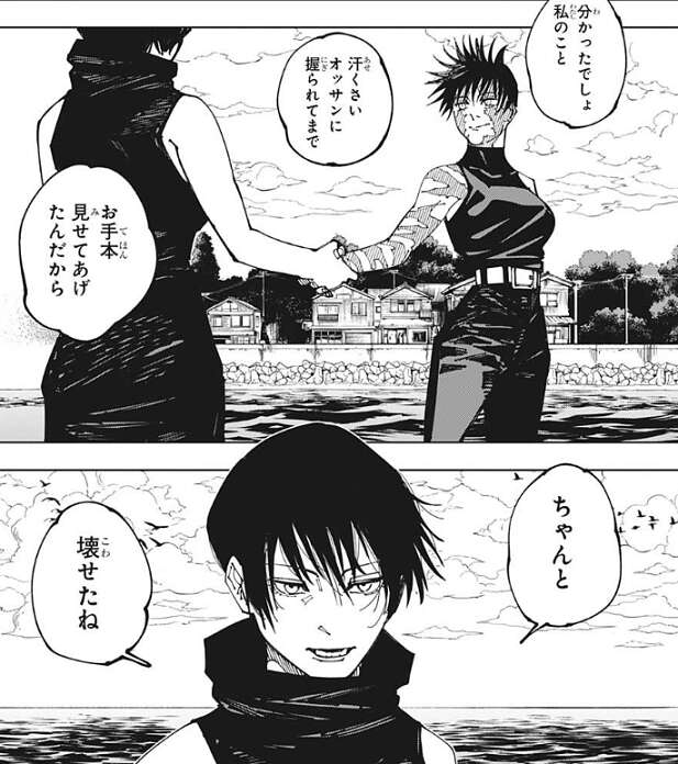 真希と直哉の戦い、決着です。直哉は領域「寺胞月宮殿」を展開しますが、どんな領域かというと、直哉が触れた者は直哉と同じ動きをしないと1秒止まってしまう、というものでした。しかもこの領域では、細胞の一つ一つが術式対象で、一度体を動かせば細胞一つ一つがズレて、体中にダメージを負ってしまう、という効果もあり直哉に触れてしまうと、動くことが出来なくなってしまいます。しかし、領域の必中効果は呪力を持たない真希を認識できず、真希は領域の中でも動きを制限されることはありませんでした。最後は真依が遺した刀で直哉を倒し、戦いを終わらせました。