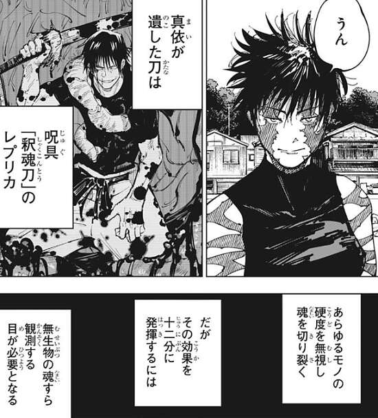 真希が遺した刀は、呪具「釈魂刀」のレプリカで、あらゆるモノの硬度を無視して魂を切り裂くことが出来ます。しかし、その効果を十二分に発揮するには、無生物の魂すら観測する目が必要となるようで、今まで真希は使いこなせていませんでした。
