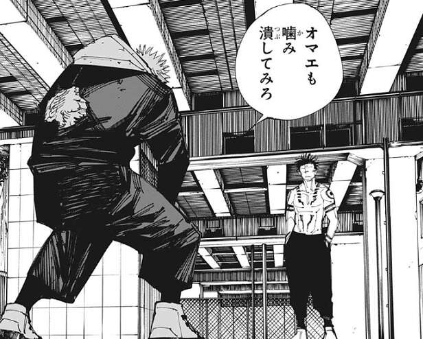 オマエも噛み潰してみろ、不幸(おれ)をよ、と虎杖は宿儺に言うと、来てみろ、と宿儺は虎杖を挑発します。