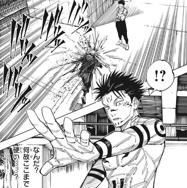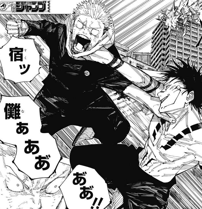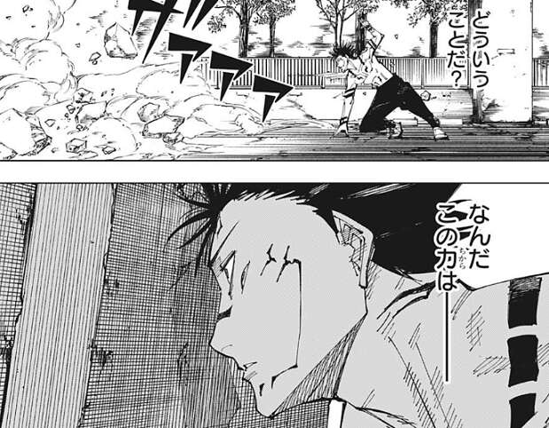 虎杖が宿儺に攻撃した衝撃で、ビルの一部が崩壊します。虎杖の異常な力に、どういうことだ?なんだこの力は、と宿儺が心の中でつぶやき、戸惑います。虎杖はさらにビルの壁を宿儺の方に蹴飛ばして、ビルの壁を宿儺にぶつけます。