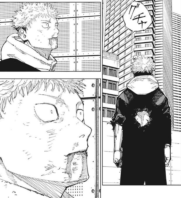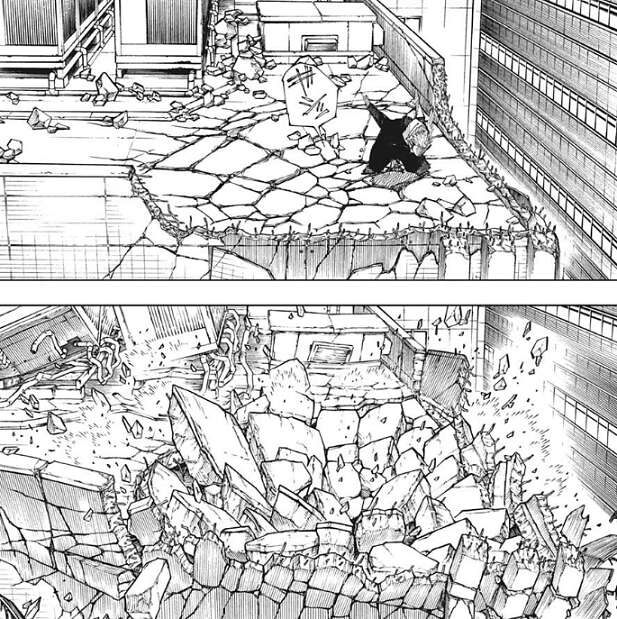 虎杖は一瞬でビルの屋上へジャンプして移動します。ビルの屋上へ飛び上がった時の衝撃で、コンクリートが砕けています。