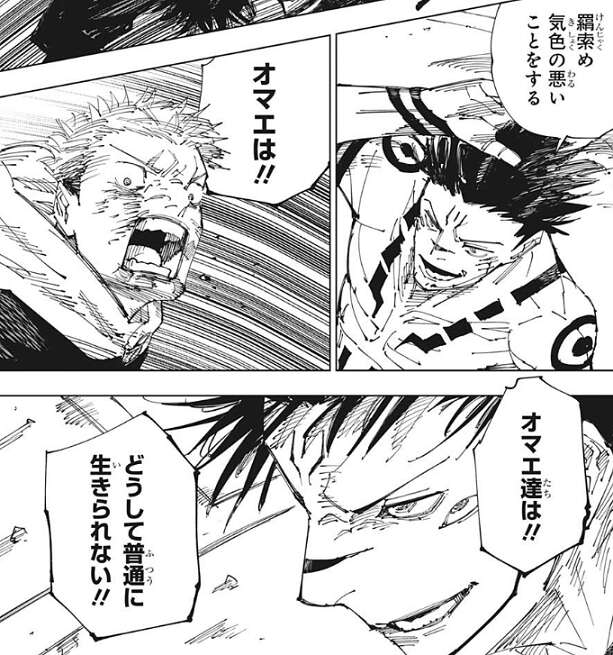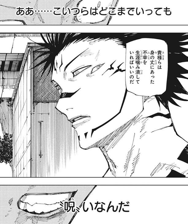 宿儺は、貴様らは身の丈にあった不幸を生涯噛み潰していればいいのだ、と虎杖に続けて言います。虎杖は、こいつらはどこまでいっても“呪い”なのだと、再認識します。