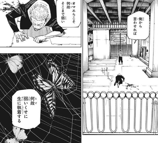 虎杖は宿儺に、どうして不幸を振り撒かずにはいられないんだ!!と、叫びますが、宿儺は虎杖に斬撃を加えます。そして、オマエらこそ何故そこまで弱い、何故弱いくせに生に執着する、と宿儺は虎杖に言います。