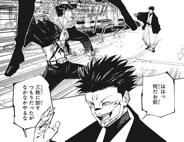 緊張する石流が答える前に、宿儺は斬撃を石流に飛ばします。宿儺は石流を三枚に卸すつもりだったようですが、石流は体に傷がついただけで斬撃をかわします。