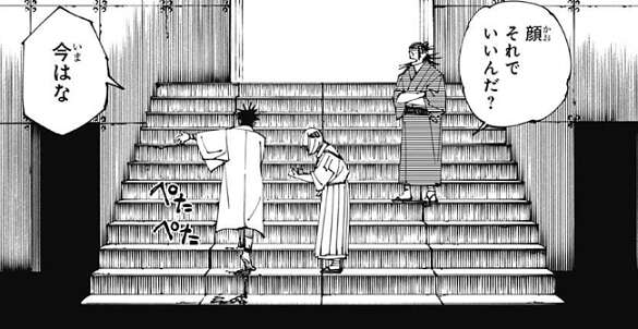 禪院家へと戻った宿儺や裏梅は、宿儺が行おうとしている浴の準備を始めます。裏梅が浴の準備をしている間、羂索は死滅回游を終わらせようとしている事を裏梅に話します。羂索の目的である「天元と人間の重複同化」は、死滅回游を終わらせないと実行できない、と羂索は裏梅に言います。そして、“永続するゲームを終わらせる”という無理難題の縛りを羂索自身にかけることで、死滅回游と言う理不尽なゲームを成立させていたようで、これをどうやって終わらせるかは、ここでは羂索は話しません。それより羂索は浴に興味があるようです。