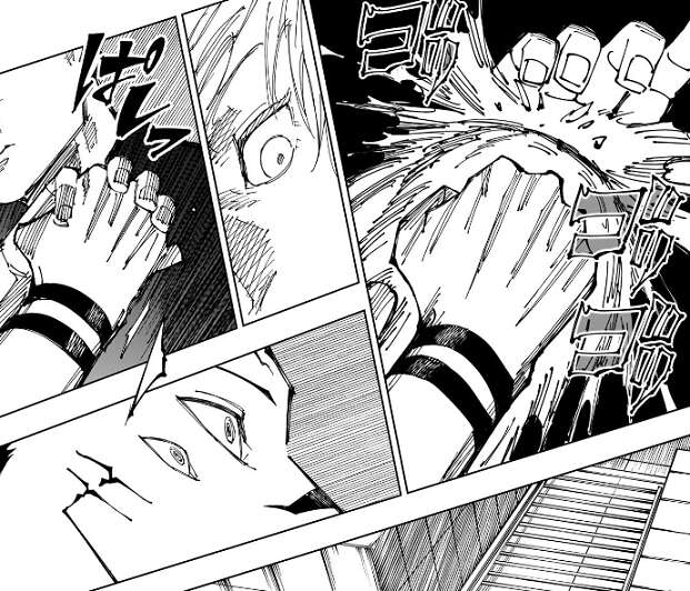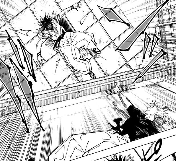呪力が込められた拳を五条に突き出し、五条は呪力で防ぎますが宿儺の拳は呪力をゴリゴリと削っていきます。それを見て五条は宿儺の拳を簡単に受け止めます。そのまま落下する高層ビルの中に、二人は突入します。