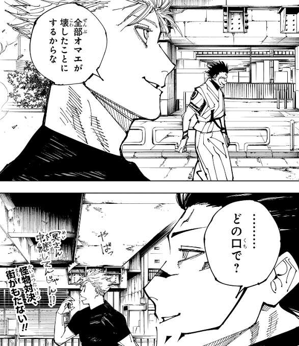 その瓦礫の中から、二人は無傷で出てきます。五条は、全部オマエが壊したことにするかならな、と言いますが、………どの口で?と、宿儺はあきれます。この時、五条は冥冥が術式を使って戦闘を中継している事に気付き驚きます。