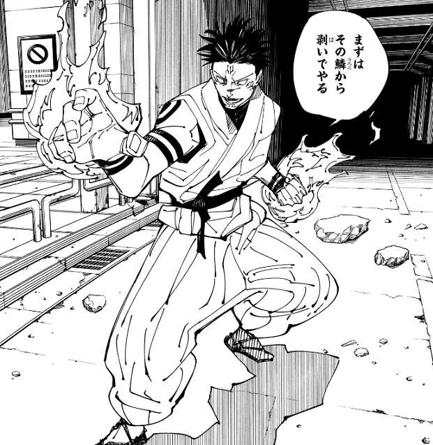 まずはその鱗から剥いでやる、と宿儺は言うと戦闘態勢をとります。すると、じゃあなんでその面のままなんだよ、と五条は言い、僕に手加減してほしかったんだろ、と宿儺に煽り返します。