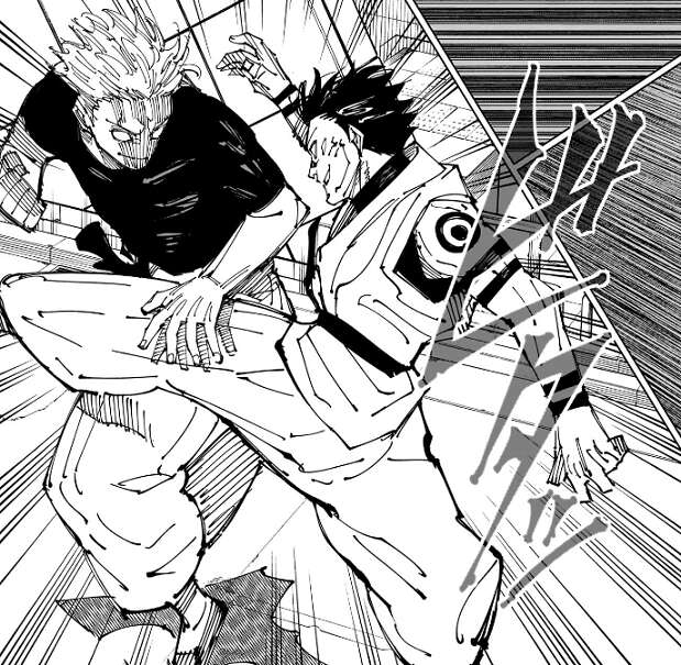 二人の言い合いが終わると、五条と宿儺の近接戦闘が始まります。宿儺が蹴りを出しますが、五条はこれをかわしパンチを出します。しかし、これも宿儺はかわし五条にパンチを繰り出します。