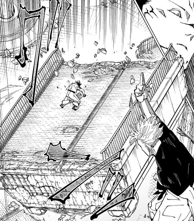 さらに五条は宿儺に攻撃を加えようとしますが、宿儺は何度か五条の攻撃をかわします。すると今度は、五条は呪力を使って足場の橋を崩そうとしますが、橋が地面に落ちる寸前に呪力で止めます。