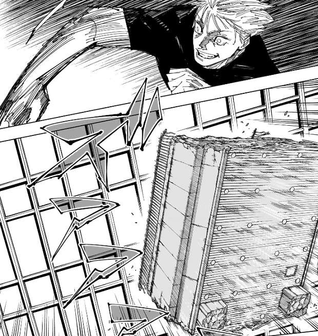 五条は宿儺のパンチをかわすと、呪力を使って宿儺を壁まで吹っ飛ばします。壁に激突した宿儺は、そのまま壁の窓を突き破って後ろの壁まで飛ばされます。