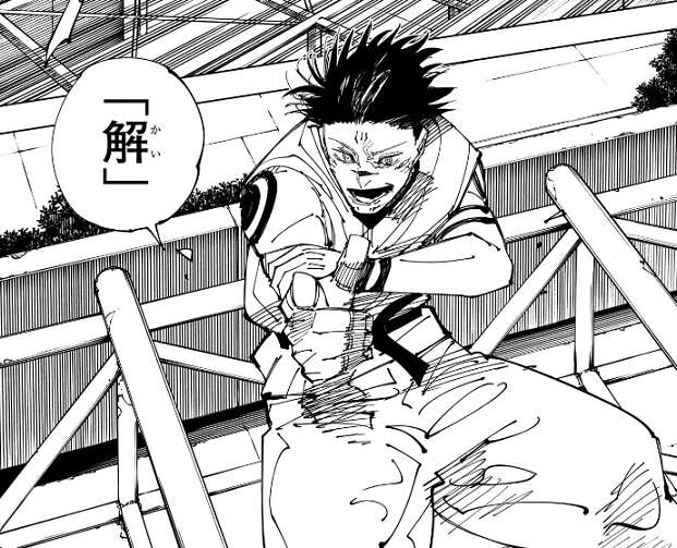 そして、呪力で空中に制止させた橋を向かいの高層ビルに、宿儺ごとぶつけようとします。しかし、橋ごと高層ビルにぶつけられる寸前に、宿儺は脱出し別の高層ビルに移動します。