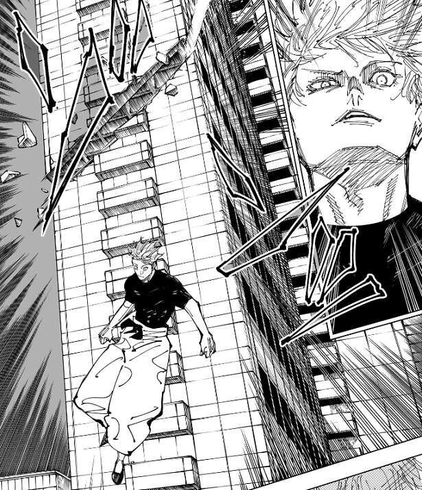 斬撃は五条の後ろの高層ビルを真っ二つにし、切断された高層ビルの上部分が五条に向かって落下してきます。そこに宿儺が拳に呪力を込めて、五条に向かってきます。
