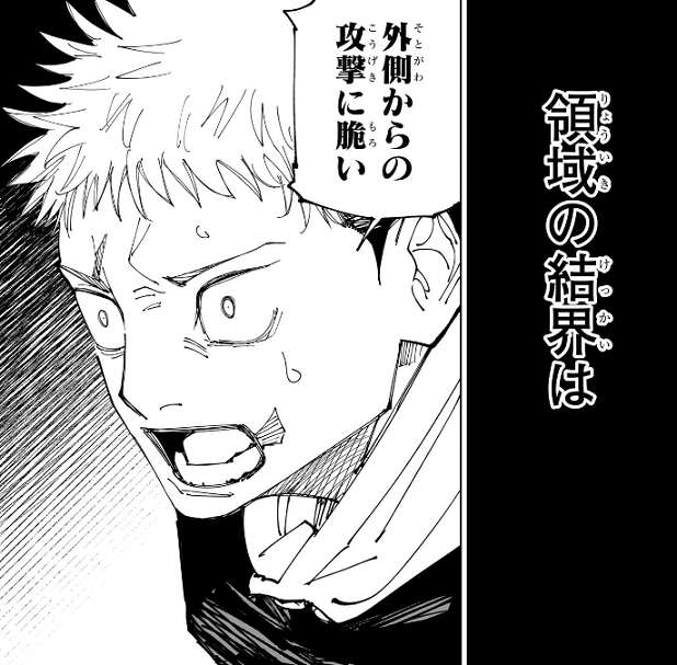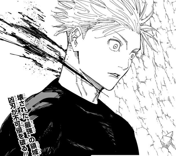 領域の押し合いが始まり結界内では互角ですが、宿儺の領域の効果範囲は五条の領域の外殻より外側に達します。そして、領域の結界は外側からの攻撃に脆く簡単に外側から侵入、破壊出来たりします。
