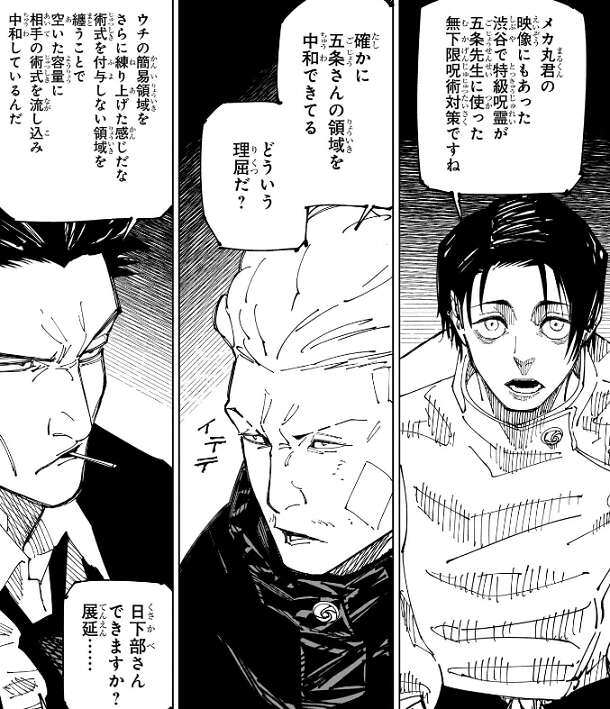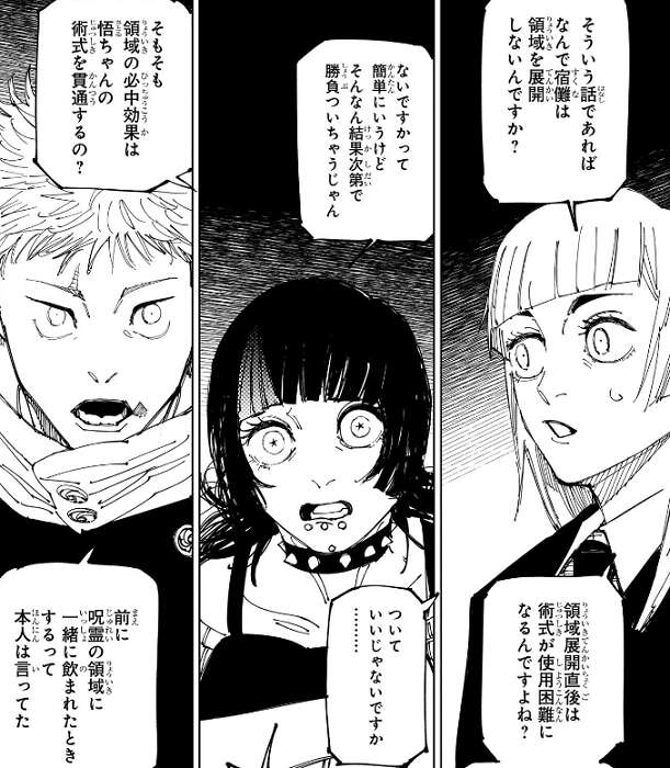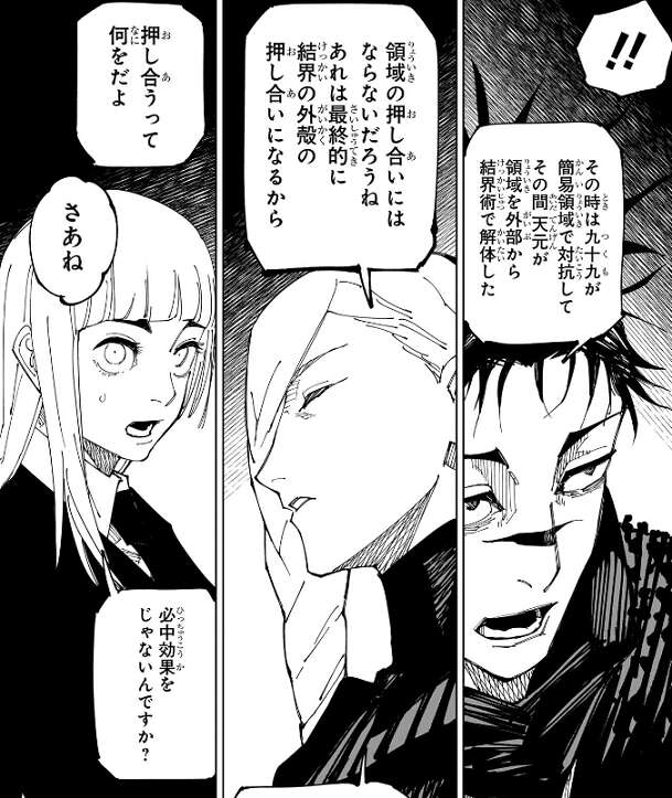 宿儺が結界を閉じずに領域を展開するのがあり得ない、という話から、伏黒は不完全な領域を展開した時に結界を閉じなかった、と真希が言いますが、それは建物や既存の結界を外殻に利用したという話で、宿儺の話と比べると次元が低いと日下部が答えます。羂索も結界を閉じずに領域を展開したという事を脹相が言い、もしその時に九十九が領域を展開していたらどうなったか、という話にもなります。結界の外殻の押し合いになるから、外殻が無ければ領域の押し合いにはならないだろう、という意見と、九十九の領域内で付与した必中効果を巡って押し合う事になるのでは?と、いう意見がでますが、結論は出ません。