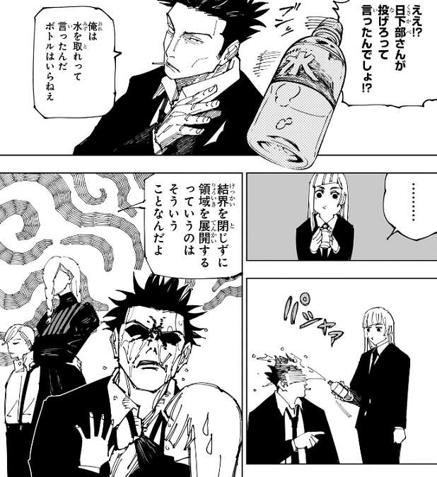 それを聞いて、日下部、鹿紫雲一、秤、乙骨が、ありえないと言います。三輪は結界を閉じずに領域を展開する、ということがどれくらいすごい事かよく分かっていないようで、日下部がペットボトルの水を取るように三輪に言います。三輪は水をペットボトルごと日下部に渡しますが、日下部は、何してんだ、水を取れって言ったんだ、ボトルはいらねえ、と三輪に言いペットボトルを投げ返します。意地悪を言われて三輪はペットボトルの水を日下部に投げかけて仕返しをし、日下部の怒りを買いますが、冥冥は、結界を閉じずに領域を展開するのはそういうこと、と説明します。
