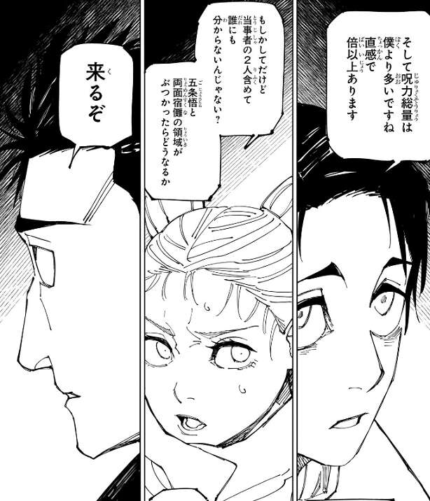 宿儺が領域の押し合いをしないのは、領域を展開するにはめちゃくちゃ呪力を食うから、という会話にもなりますが、五条は六眼があり呪力効率がベラボウによく領域を展開するには問題ないという話になります。宿儺に関しても、術式発動までのキレ、展延と生得術式の切り替えのキレともに神懸っており、五条に六眼がなければ確実に呪力効率は宿儺が勝つぐらい、呪力効率はいいそうです。また、乙骨の直感で呪力総量は乙骨の倍以上はあり、2人とも呪力量の問題で領域を展開しないわけじゃないようです。結局、誰にも分からないんじゃない?と、言う話になりますが、来るぞ、と日車が突然発言します。