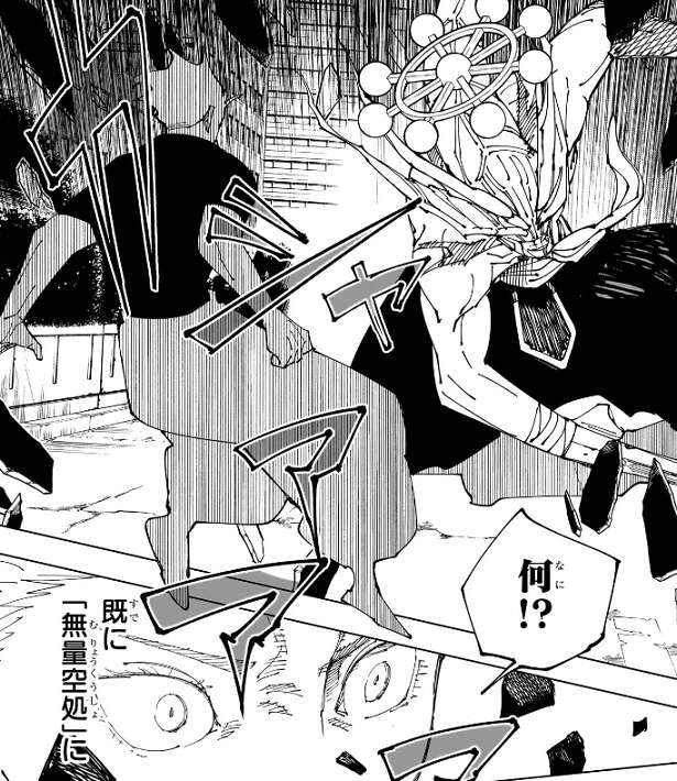 宿儺は「無量空処」をくらい、“知覚”“伝達”生きるという行為に無限回の作業を強制させられ、いつまでも情報が完結しません。