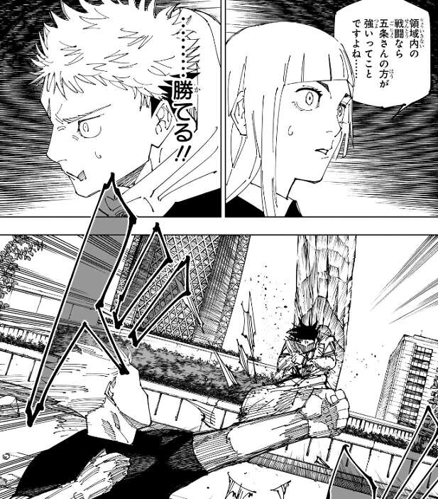 またも同時に五条と宿儺の領域が崩壊し、ハラハラさせるね、と冥冥がつぶやきます。しかし、またも3分で五条は宿儺に領域を保てなくなるほどのダメージを与えているので、領域内の戦闘なら五条さんの方が強いってことですよね……、と三輪がつぶやくとおり、五条の方が有利のようです。虎杖は、………勝てる、と五条の勝利を確信します。