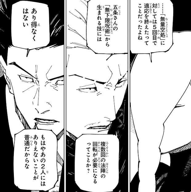 「無量空処」に対しては5回目で適応を終えていたので、五条の「無下限呪術」から生まれる技に対して適応するには、魔虚羅とはいえ複数回の法陣の回転が必要になる、と高専のメンバーは推測します。もはや、この2人に関してはあり得ないことが普通になっています。