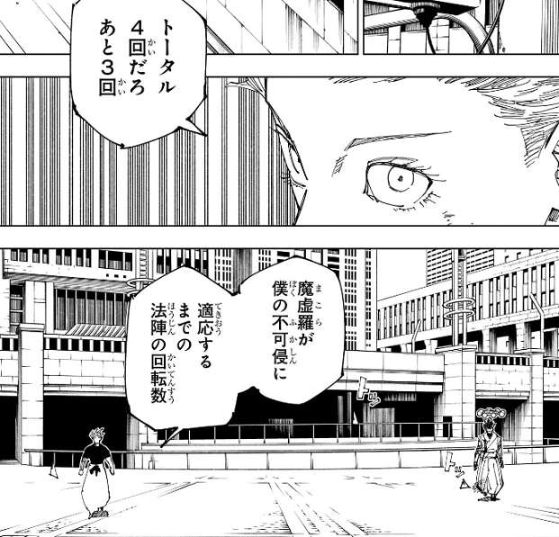 そして、五条も複数回の法陣の回転が必要という事には気付いていて、トータル4回だろ、あと3回、と宿儺に言います。魔虚羅が五条の無下限呪術に適応するまで、トータルで4回法陣を回転する必要があり、先ほど1回回転したので、あと3回回転が必要となる、と五条は推測します。