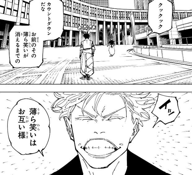 五条の推測は正しいようで、カウントダウンだな、お前のその薄ら笑いが消えるまでの、と宿儺は五条に答えます。すると、薄ら笑いはお互いさま、と五条は笑い顔を作って宿儺に答えます。