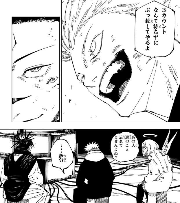 そして、3カウントなんて待たずにぶっ殺してやるよ、と五条は宿儺に言い放つと、宿儺は余裕があるのか笑みを浮かべます。あの人恵のこと忘れてませんよね?と、来栖が心配そうに虎杖に質問し、……多分、と虎杖は自信なさげに答えます。………いいんだよ忘れて、と鹿紫雲一は言いますが、おそらく虎杖辺りが、よくねぇ!!と、ツッコミます。