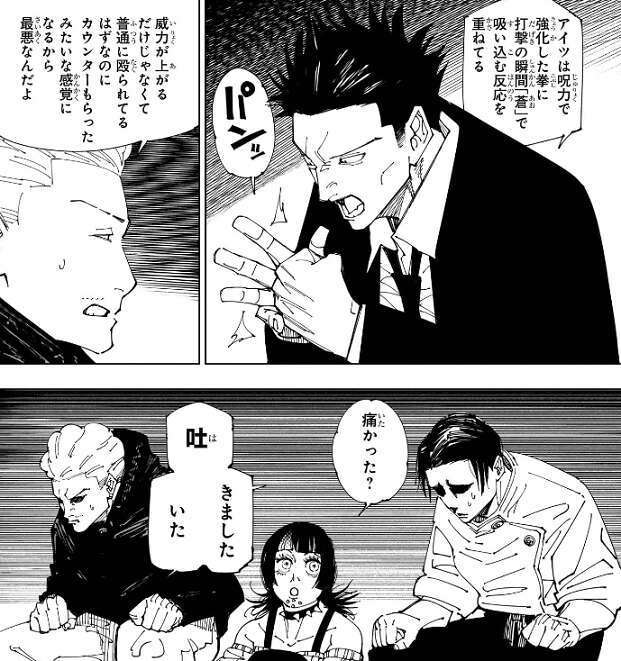 五条は呪力で強化した拳に打撃の瞬間「蒼」で吸い込む反応を重ねることあるようで、それをくらうと威力が上がるだけではなく、カウンターをもらったみたいな感覚になって最悪だ、と秤は言います。打撃の瞬間「蒼」を重ねられるとかなり痛いようで、乙骨と秤は吐いてしまったようです。