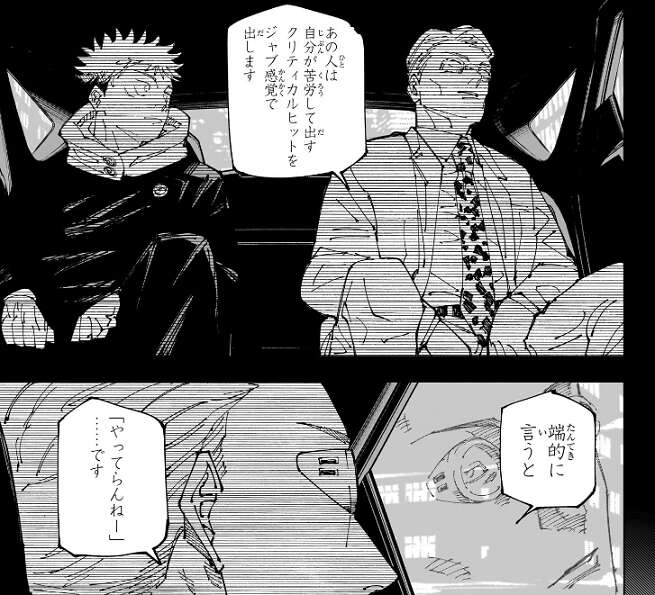 虎杖は七海が、五条は自分が苦労して出すクリティカルヒットをジャブ感覚で出します、と言っていた事を思い出します。つまり、「やってらんねー」という事を七海は言いたかったようで、日下部も五条がこれ以上何をやっていのか知らんそうです。