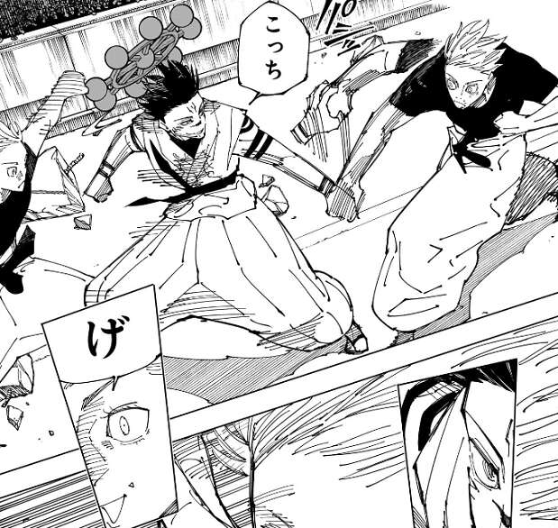 場面は五条と宿儺の戦いに戻りますが、五条は宿儺の頭を掴み壁に押し付けたり、投げ飛ばしたりしています。これもおそらく、無下限呪術を応用して攻撃してるのでしょうが、日下部の言う通り無下限呪術をどう使って攻撃しているのかよく分からず、凡人の想像を超えた戦闘が続きます。