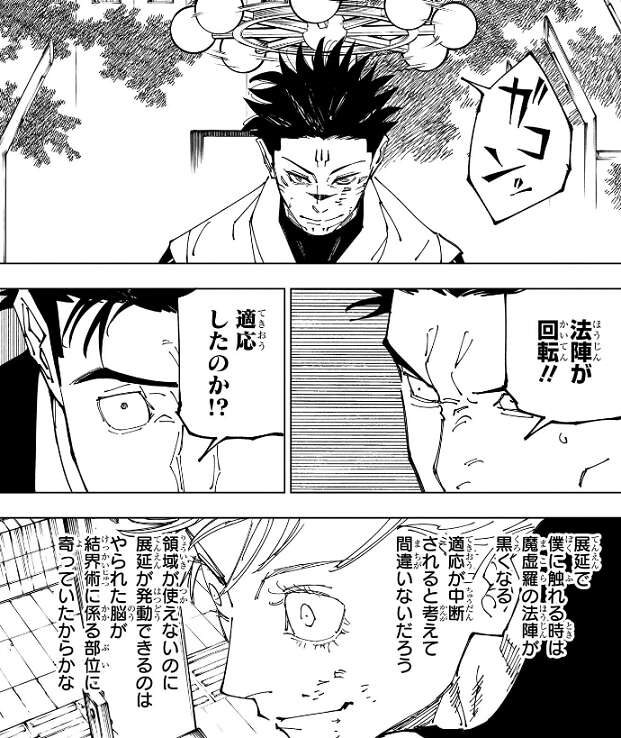 いつの間にか魔虚羅の法陣の色が元に戻っていて、法陣が回転します。法陣が回転したという事は、魔虚羅が無下限呪術に適応した事になりますが、宿儺は魔虚羅を出しません。五条は、宿儺が展延で自分に触れている時は魔虚羅の法陣が黒くなる、と推測しその間は事象への適応が中断されると考えます。宿儺も領域が使えないはずですが、展延が発動できるのはダメージを負った脳が、結界術に係る部位に寄っていたから、と推測します。