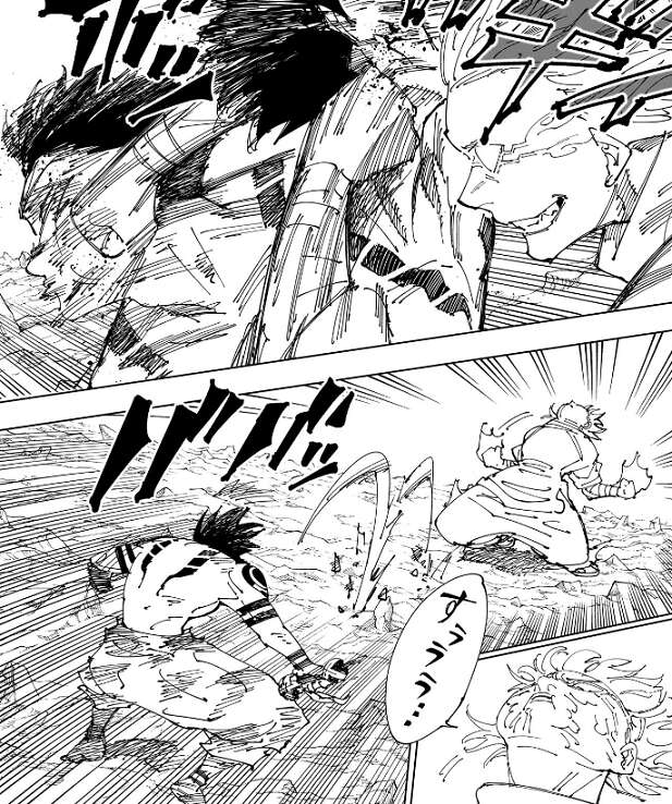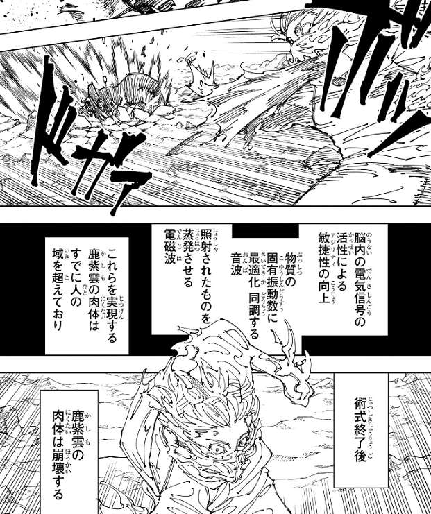 さらに鹿紫雲一はパンチを繰り出します。宿儺はパンチを避けますが、衝撃波も生じているので宿儺はダメージを負ってしまいます。さらに鹿紫雲一は攻撃を畳みかけて、宿儺にダメージを負わせます。鹿紫雲一の術式は、電気信号の活性によるアジリティの向上、さらに音波や電磁波も攻撃と一緒に生じさせるようで宿儺はかなり苦戦します。しかし、術式「幻獣琥珀」を実現するために鹿紫雲一の肉体は既に人の域を超えていて、術式終了後鹿紫雲一の肉体は崩壊してしまうようです。まさしく、一発しか使えない術式効果のようです。