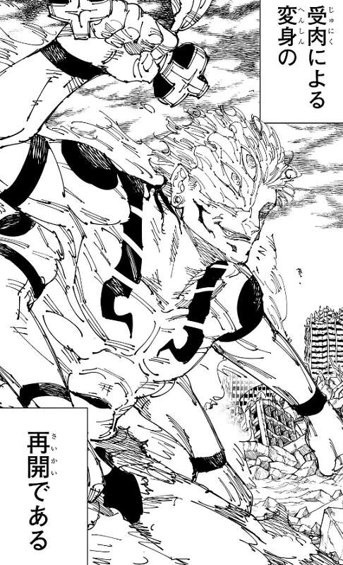宿儺は空間 世界ごと存在を分断する技を獲得したので、鹿紫雲一にも使ってあっさりと勝利するかと思われましたが、宿儺は新しい技を使わず鹿紫雲一の術式「幻獣琥珀」に苦戦します。ここで五条との戦いのダメージも含めて、宿儺はかなりのダメージを負ってしまいますが、受肉による変身の再開によって肉体を修復します。これが、おそらく宿儺の切り札なのでしょう。宿儺はダメージがゼロの状態で復活すると予想しますが、そうなると鹿紫雲一は敗色濃厚です。鹿紫雲一は不満でしょうが、真希や乙骨がタイマン勝負に割って入ってくる展開はあるでしょうか?