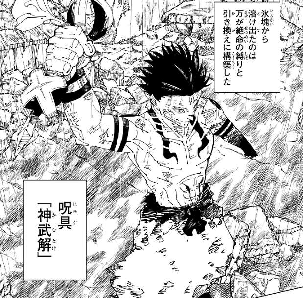 呪具「神武解(かむとけ)」は万が絶命の縛りと引き換えに構築したもので、宿儺は呪具「神武解」を鹿紫雲一に使います。神武解を使用した後、電撃のようなものが出ているので雷系の特性がある呪具のようですが、万が絶命の縛りで構築した呪具なのでかなりの能力を秘めていると思われます。