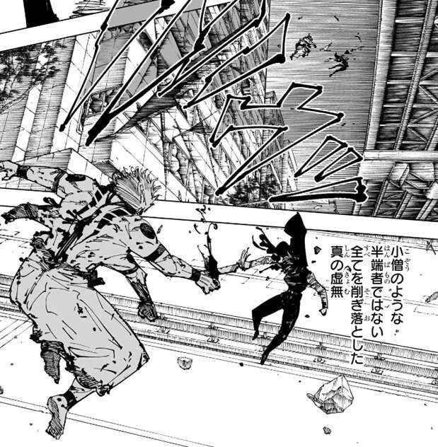攻撃してくる真希の顔を掴むと、真希をビルの外へと押し出します。そして好戦的になった宿儺は真希を追いかけて、追撃を仕掛けます。真希を、小僧のような半端者ではない全てを削ぎ落した真の虚無、と宿儺は表現し、真希に語りかけます。