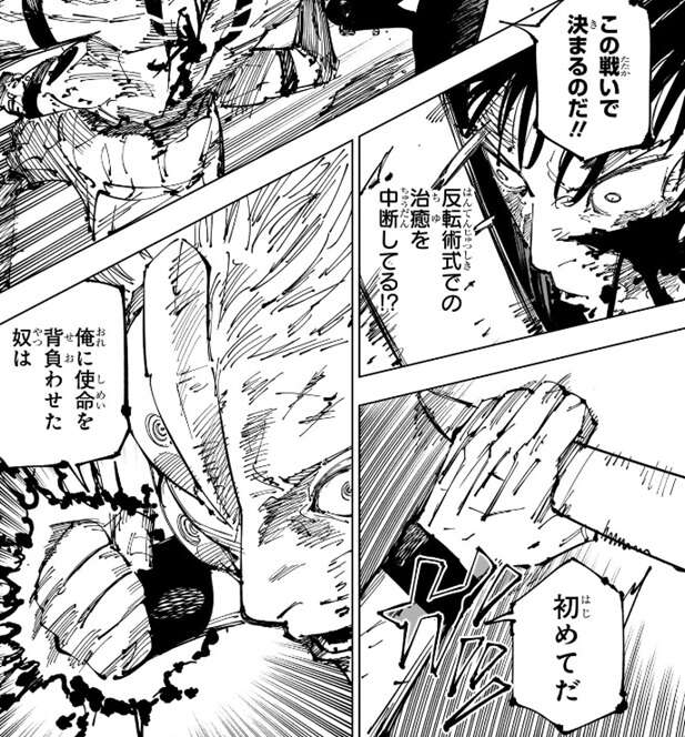 宿儺はいつの間にか反転術式での治癒を中断していて、真希を斬撃の術式でなく打撃で攻撃します。さらに好戦的になった宿儺は、呪術と肉体、どちらが力として磨き上げるに値するのか、この戦いで決まると一方的に決めつけます。そして、初めてだ、俺に使命を背負わせた奴は、と宿儺は言うと拳に呪力を込めて打撃を放ちます。