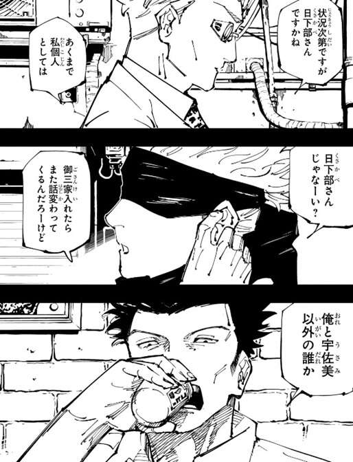 最強の一級術師は誰?という質問に、冥冥は日下部の名前を挙げて、七海と五条も条件付きながら日下部を挙げます。歴戦の術師達は日下部を評価していますが、日下部は、俺と宇佐美以外の誰か、と答え自分ではないと言いたそうです。ちなみに、ここで出た宇佐美という名前ですが、現状この名前のキャラは出ていないはずなので、誰の名前なのか不明です。