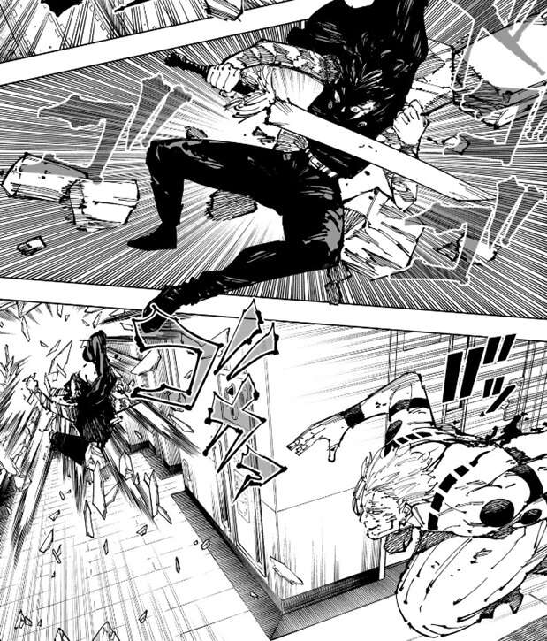 真希に攻撃され、今度は宿儺が吹っ飛ばされ、壁に叩きつけられます。立ち上がる宿儺に、真希は高速で移動しつつ、さらに追撃しようとします。