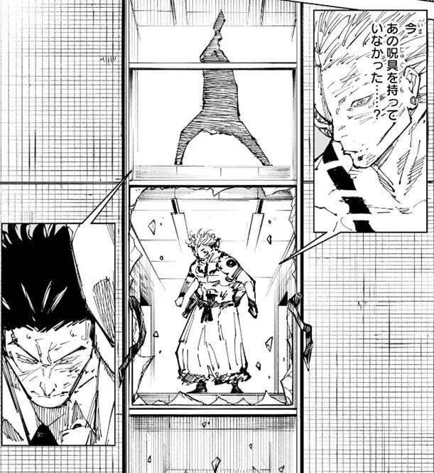 あっさりと猪野を倒した宿儺ですが、猪野が第246話では持っていた大鉈の呪具を今は持っていないことに気付きます。その大鉈の呪具は、宿儺がいる階のさらに1階上にいる日下部が持っていました。日下部は大鉈の呪具で1階上から、宿儺を奇襲しようとしていました。