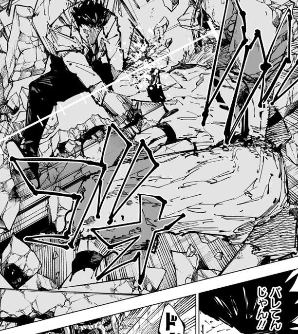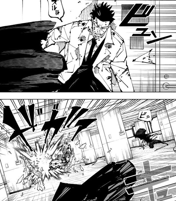 しかし、二人は難なく崩れてきたビルを避けて戦闘を続行、宿儺は自動車を真希に向かって投げて、真希が自動車を避けている隙に真希に斬撃を飛ばします。真希は釈魂刀で斬撃を受け止めますが、吹っ飛ばされてしまいビルに激突します。
