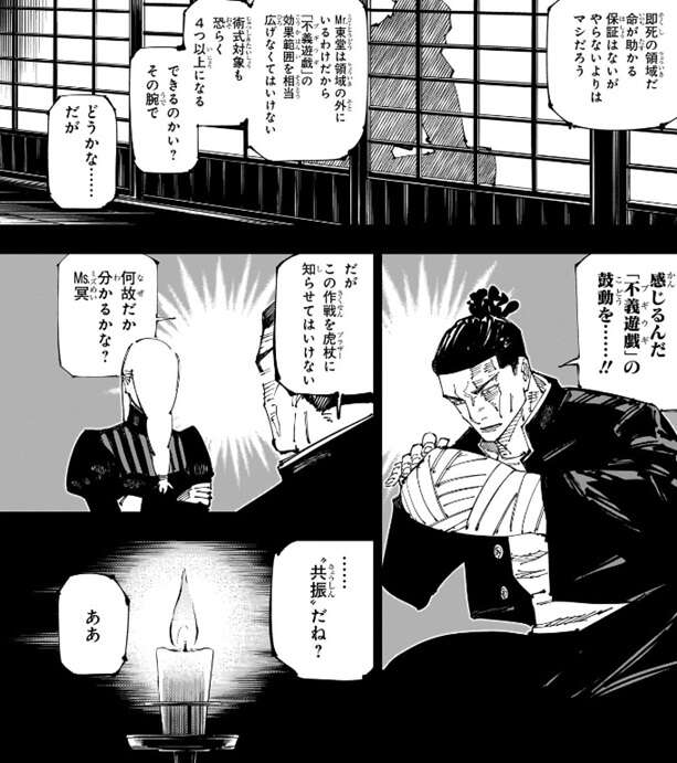 場面は東堂と冥冥の話し合いの場に変わります。東堂は、冥冥の烏と自分の術式で宿儺の領域内の人間を領域外へ脱出させる作戦を、冥冥に伝えていました。東堂は、即死の領域なので、この作戦で命が助かる保証はないがやらないよりはマシだろう、と言いますが、冥冥は、東堂は領域の外にいるわけだから「不義遊戯(ブギウギ)」の効果範囲を相当広げなくてはいけない、さらに術式対象も恐らく4つ以上になる、と懸念点を挙げて、その腕で出来るのかい?と、東堂に問いかけます。東堂は渋谷事変で真人の領域展開「自閉円頓裹(じへいえんどんか)」をくらい、左手を失い術式は死んだはずでした。しかし東堂は、感じるんだ「不義遊戯」の鼓動を……、と言い、何か術式が使えるような予感めいたものがあるようです。しかし、この作戦は虎杖には知らせてはいけない、と東堂が言うと、“共振”だね、と冥冥は答えます。