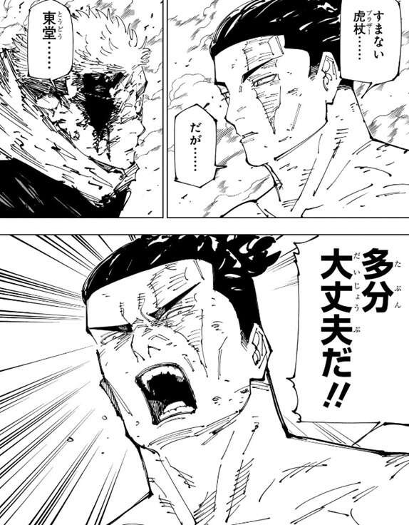 かなり色々と省略していますが虎杖もすぐに察して、多分大丈夫なんだな!!!?と、東堂の言う事を信じる事にします。