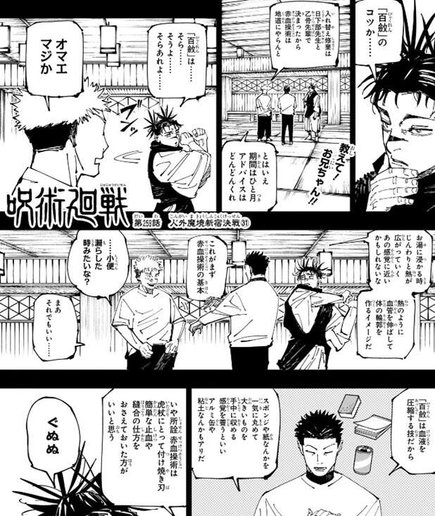 冒頭の場面は新宿決戦前へと戻り、入れ替え修行で虎杖が入れ替わるのは日下部と乙骨に決まったようですが、入れ替われる回数はひと月という期間だと一人につき2度が限界なのでこれ以上は入れ替われません。その為虎杖の赤血操術の修業は、地道に進めるしかありません。虎杖は脹相と加茂に、アドバイスはどんどんくれ、と言いますが、脹相は、「百歛」は……そら……そうよ……そらあれよ……、としか言えずアドバイスになっていません。第244話で虎杖が、脹相は教えるの下手だから、と言っていましたが、確かに下手です。