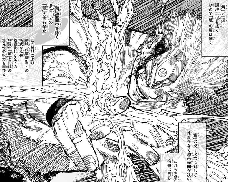 場面は前回、宿儺が「竈(カミノ)」「開(フーガ)」の炎の術式を放った直後に戻ります。「解」と「捌」の調理工程を経て初めて「竈」の扉は開く、と説明が入った事から、「解」と「捌」を使用した後でないと、「竈」の炎の術式は使えないようです。さらに「竈」の炎は火力に対して、速度がなく効果範囲が狭いという欠点があるようですが、宿儺は縛りを科すことでこの欠点を解決します。“領域展開中を除く多対一での「竈」の実行禁止”という縛りによって、領域「伏魔御廚子」の術式を拡張し、粉塵化した全ての物質が「竈」と同様の爆発性の呪力を帯びるそうです。更に宿儺は結界の仕様を一時的に変更し、生物以外の出入りを制限し、「伏魔御廚子」の出力を下げずに効果範囲内を密閉したそうです。以上の説明から、宿儺は「伏魔御廚子」の斬撃で領域内の建物等を粉塵化させて、さらに術式の拡張で領域内の粉塵化した物質に爆発性の呪力を帯びさせて、「竈」の炎の術式を使うと同時に粉塵化した物質を一気に爆発させたようです。