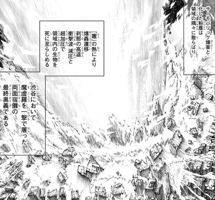 裏梅は宿儺が「竈」の炎の術式を使ったことを知ると、私達の勝ちだ、と勝利宣言します。サーモバリック爆薬と化した粉塵は領域の隅々に散らばり、「竈」の熱により爆轟遷移、刹那の高温、衝撃波、減圧と超加圧で領域内の生物を死に至らしめます。これが、渋谷において魔虚羅を一撃で屠った両面宿儺の最終奥義となります。