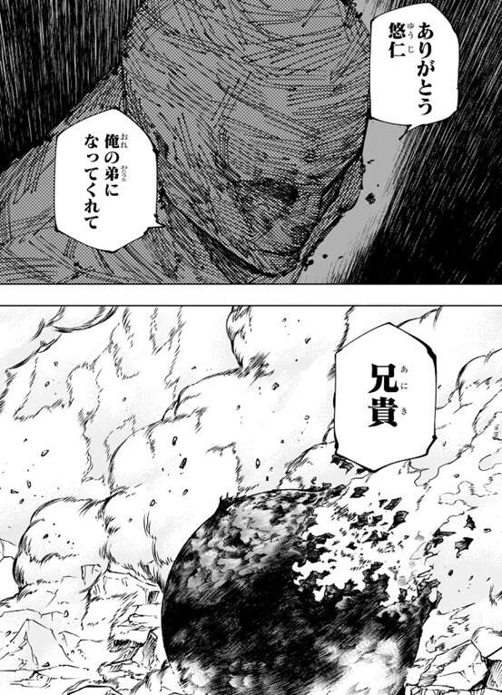そして脹相は、ありがとう悠仁、俺の弟になってくれて、と虎杖の感謝の言葉を伝えます。虎杖も、……ありがとう、兄貴、と脹相を兄貴と呼んでお礼を言いますが、脹相の体と血の壁は崩れて消えてしまいます。